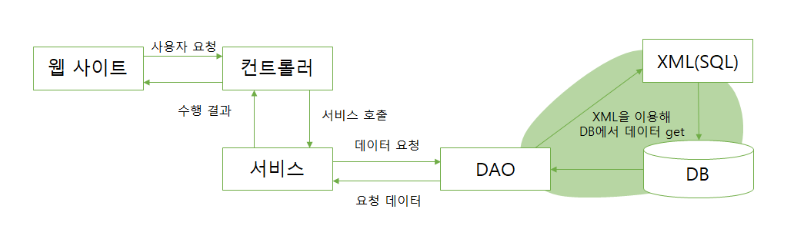- SQL문은 소스 코드 내에 직접 입력, 또는 별도의 XML(JSON도 가능) 파일로 관리함