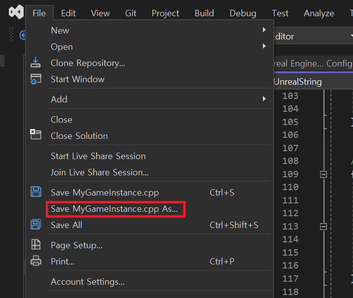 Visual Studio에서 Save As를 클릭하고